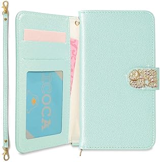 Nova Lite 3+ ケース 手帳型 かわいい ストーン パール キラキラ フラワー ストラップ付き カバー (グリーン) SIMフリー